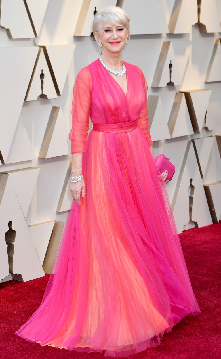 Pink was definitely a trend at this years Academy Awards. Gemma Chan wore a stunning highlighter-pink parachute like gown by Valentino. Helen Mirren looked regal in a long sleeved, layered Schiaparelli Haute Couture gown with a plunging neckline. Kacey Musgraves wore a baby-pink tiered tulle gown by Giambattista Valli giving a serious fairy princess vibe.