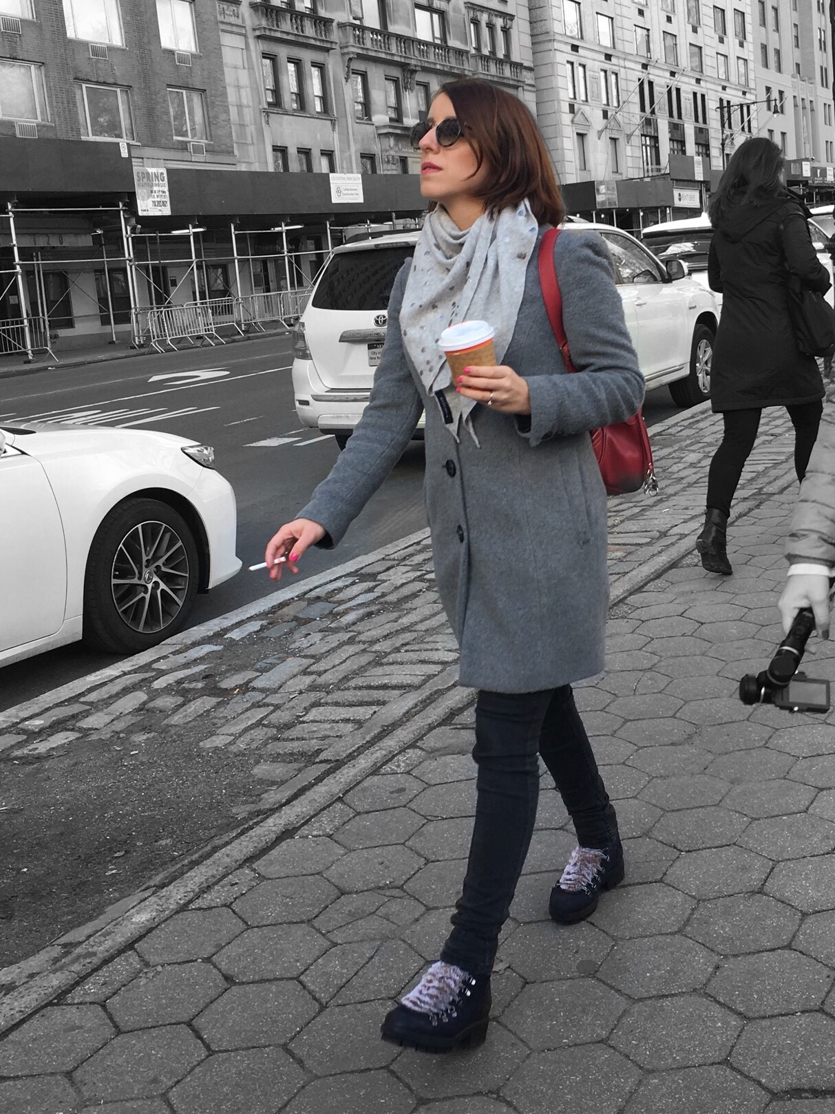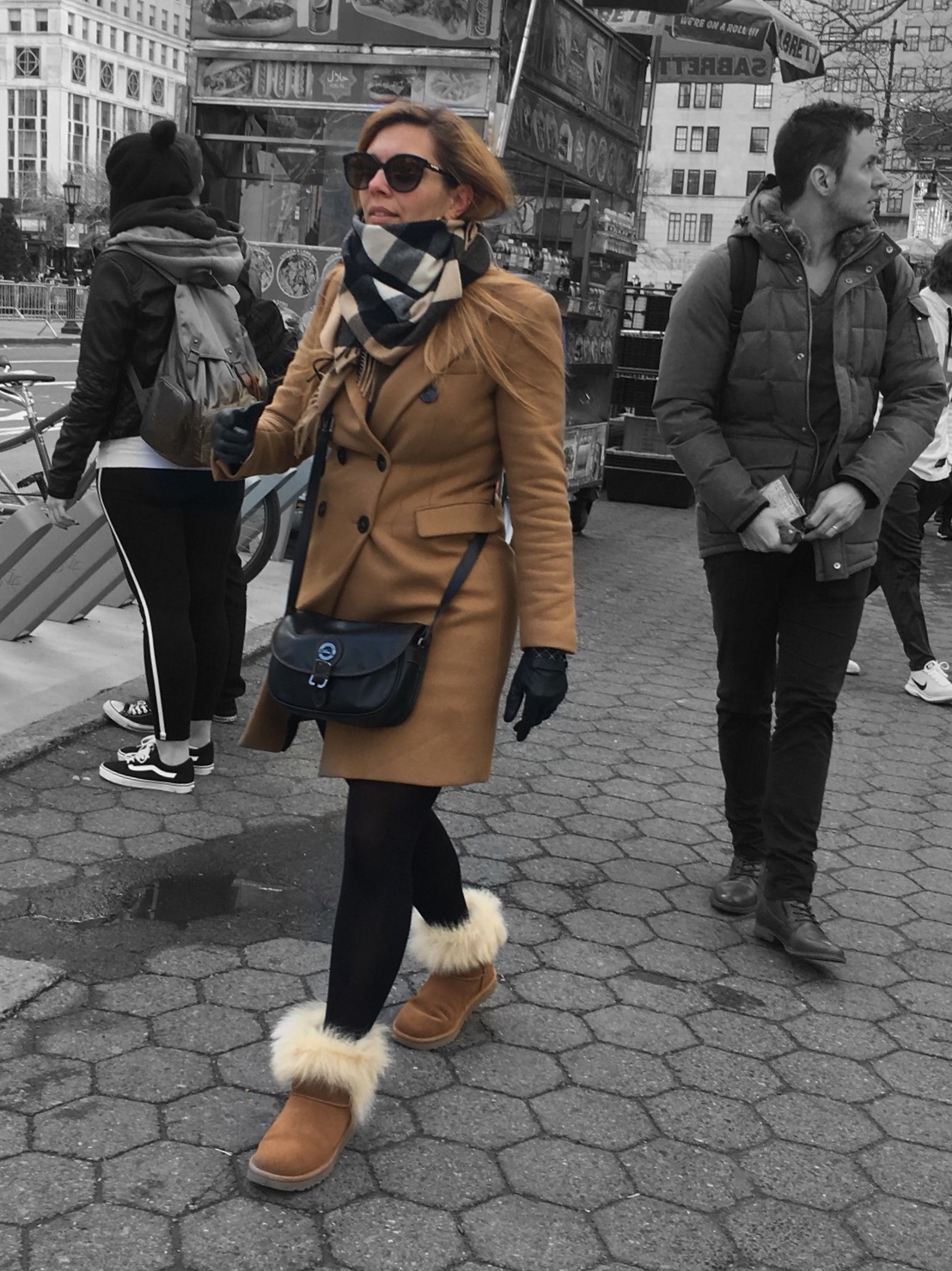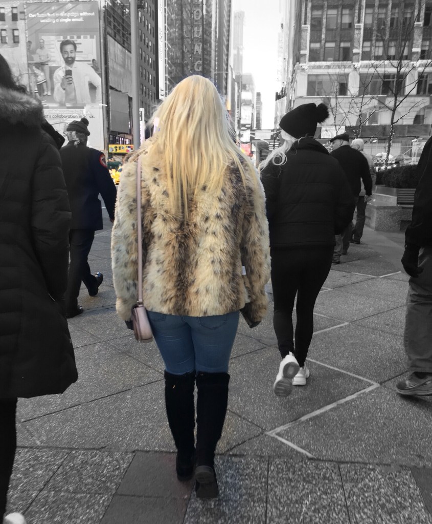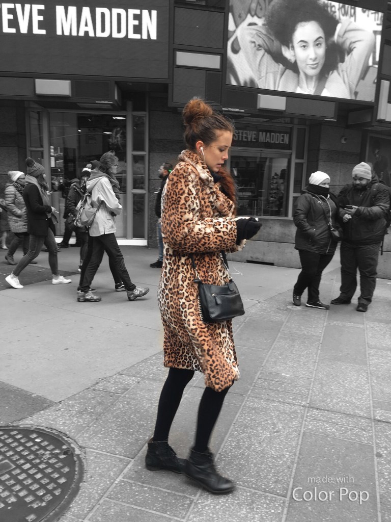 This long jacket with large notched lapels stood out the most because it was styled so well. Worn over a black turtleneck sweater dress and black tights with booties and a small over the shoulder bag, this woman looked fashionable and fierce strolling through Times Square.