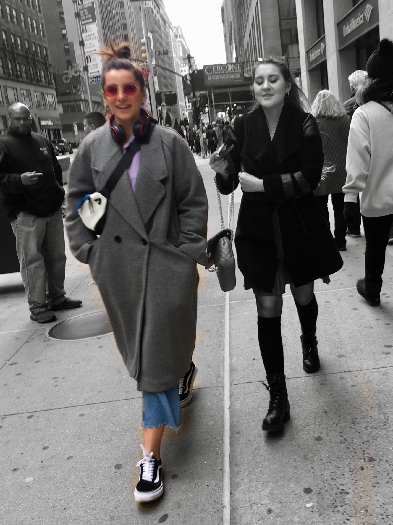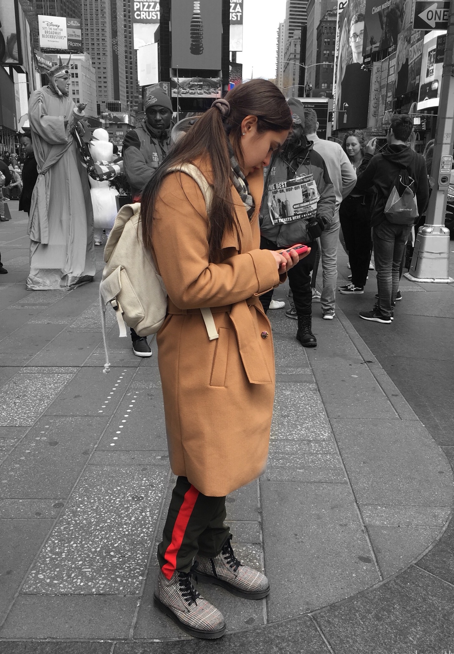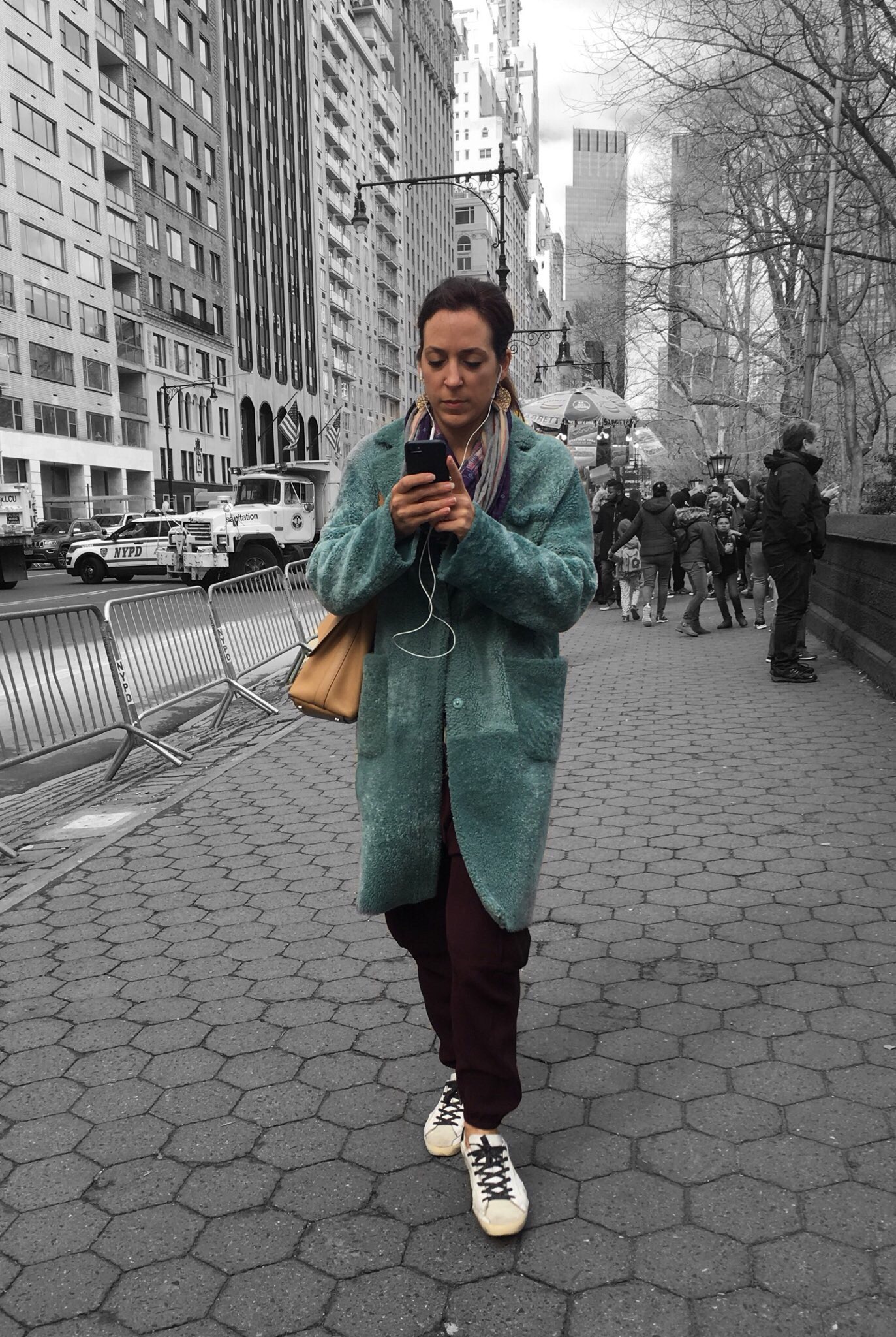This long jacket with large notched lapels stood out the most because it was styled so well. Worn over a black turtleneck sweater dress and black tights with booties and a small over the shoulder bag, this woman looked fashionable and fierce strolling through Times Square.