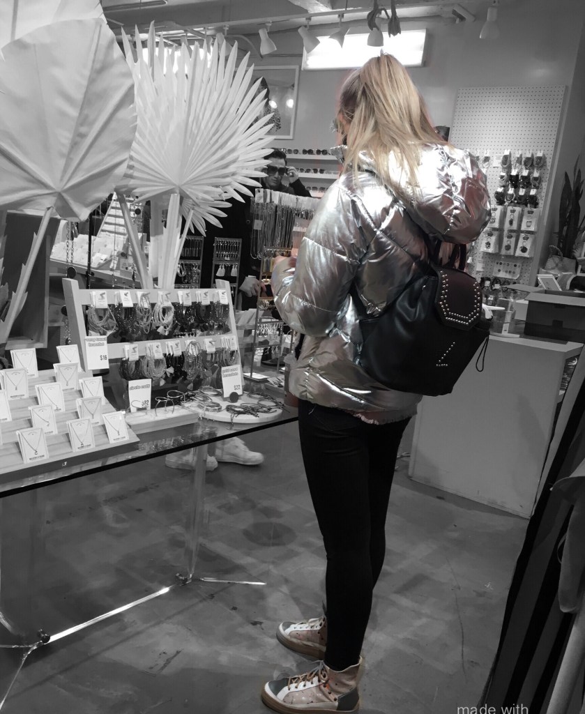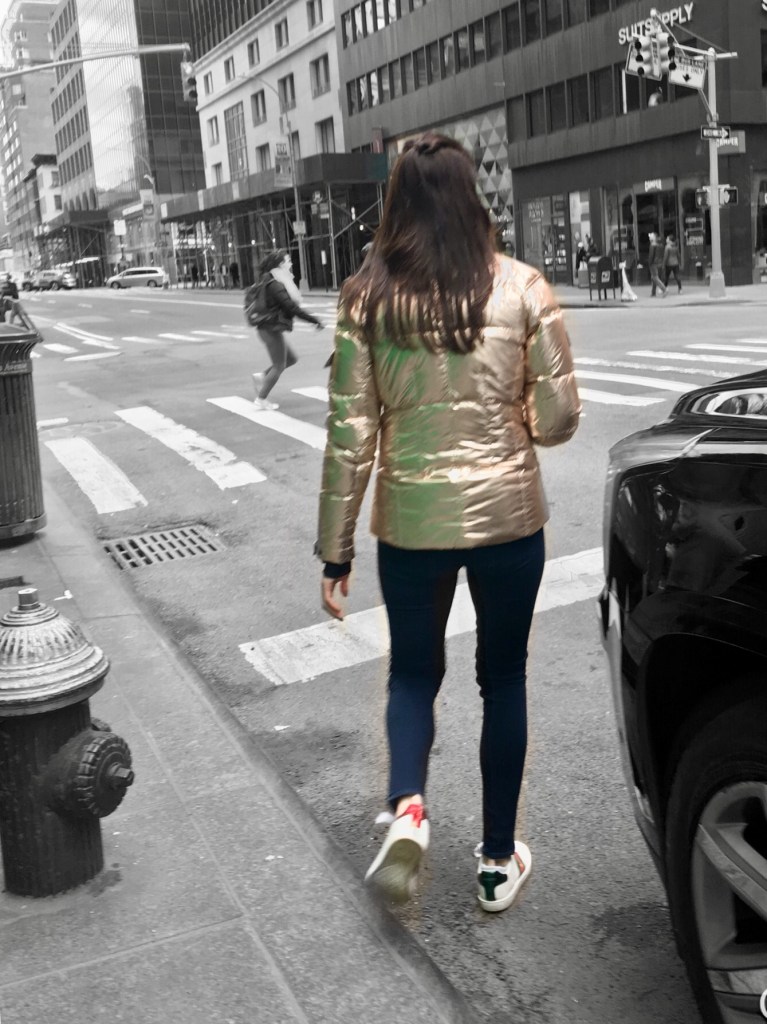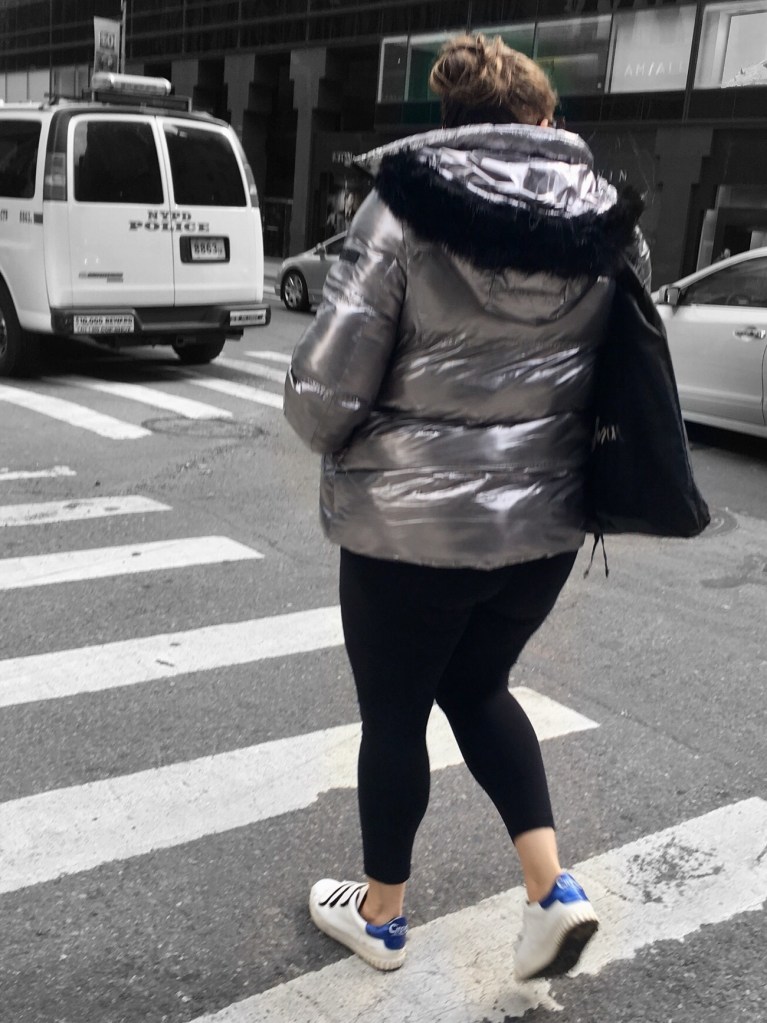 Puffer jackets are trending and they are no stranger to the runway, celebrities, world leaders and everyone in between. Metallic tones have also been hot this year, so when the two trends combine, it is bound to make a statement even if it is a revive of 90’s rave style. Silver metallic puffer jackets were spotted all around the city and looked very cool and futuristic, particularly when styled with black garments and accessories. A tighter fitting gold jacket was also spotted, but looked tacky in comparison to its silver counterparts.