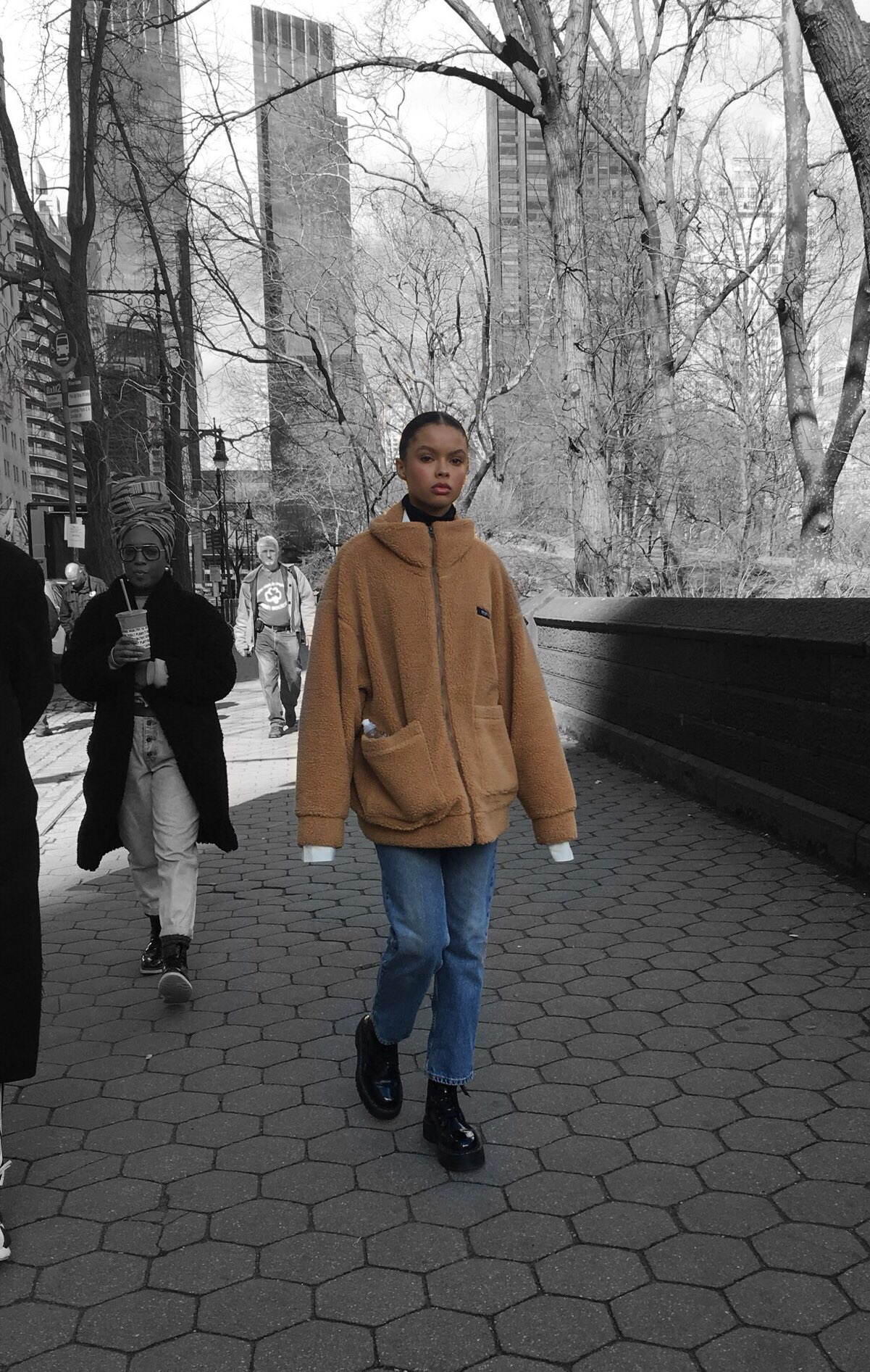 This caramel colored jacket is of a similar design to the to the famous I.AM.GIA pixie coat that was popular last year. Its loose fit and large pockets worked well with mom jeans and shiny platformed black boots. Although very simple, this urban look stood out on the streets.